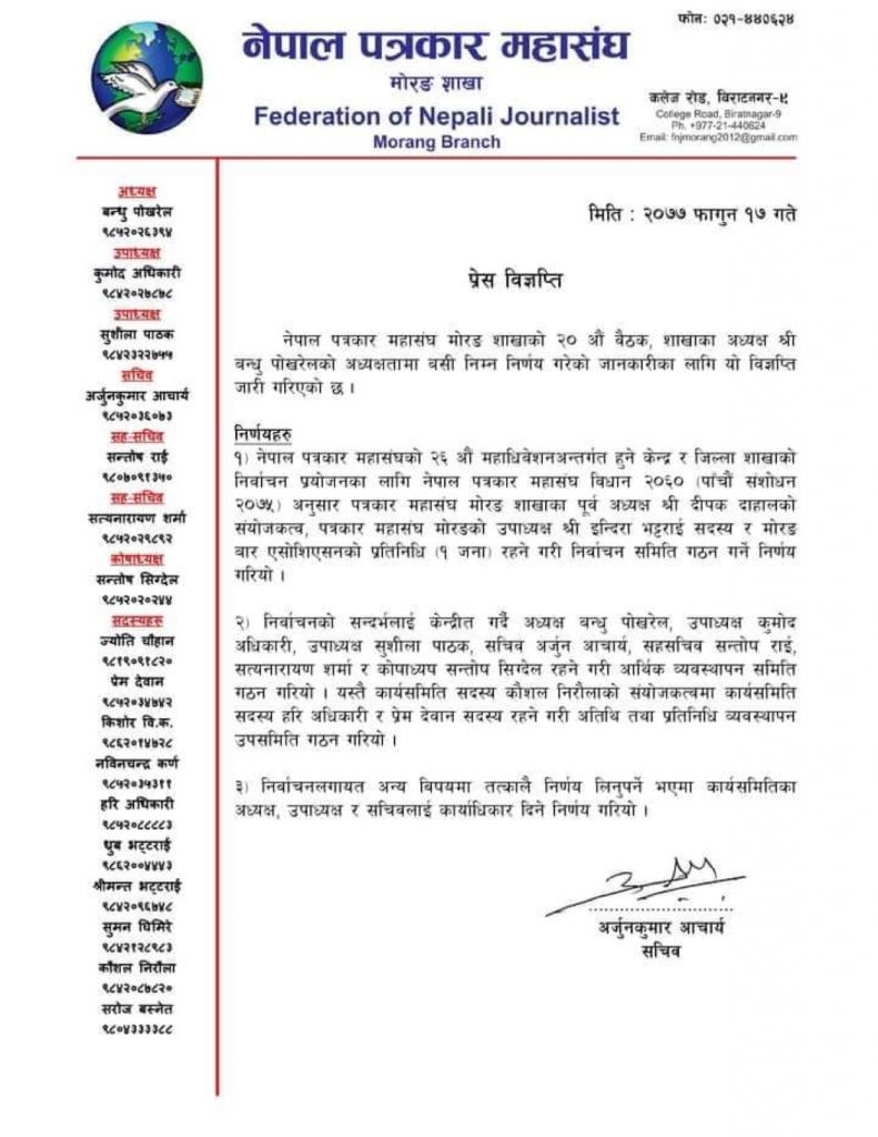 पत्रकार महासंघ मोरङ शाखाले सोमबार विग्यप्ति जारी गरेर आसन्न निर्वाचन सम्पन्न गर्न शाखाका पूर्व अध्यक्ष दिपक दाहालको संयोजकत्वमा उपाध्यक्ष इन्दिरा भट्टराई सदस्य र मोरङ बार एसोसिएसनका प्रतिनिधि सदस्य रहनेगरि तीन सदस्यीय निर्वाचन समिति घोषणा गरेको थियो ।