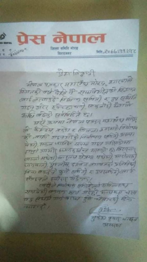 प्रेस नेपाल मोरङ अध्यक्ष मुकेश यादवले मंगलबार विग्यप्ति जारी गरेर महासंघको केन्द्र, प्रदेश र जिल्ला तहको निर्वाचनको लागि गठित निर्वाचन समिति असमावेशी र एकल जातीय रहेको भन्दै यसलाई नमान्ने बताएका हुन् ।