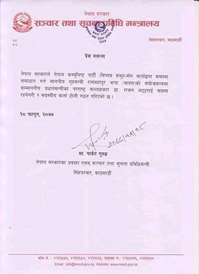 सरकारको तर्फबाट सन्चारमन्त्री पार्वत गुरुङले मंगलबार जारी गरेको विग्यप्तिमा गृहमन्त्री रामबहादुर बादल संयोजक रहेको दुई सदस्यीय वार्ता टोली गठन गरिएको विग्यप्तिमा उल्लेख छ ।