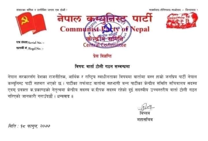 प्रवक्ता खड्गबहादुर विश्वकर्मा (प्रकाण्ड) को संयोजकत्वमा सदस्य क. दीपक रहेको दुई सदस्यीय उच्चस्तरीय वार्ताटोली गठन गरेको महासचिव विप्लवबाट जारी विग्यप्तिमा उल्लेख छ ।