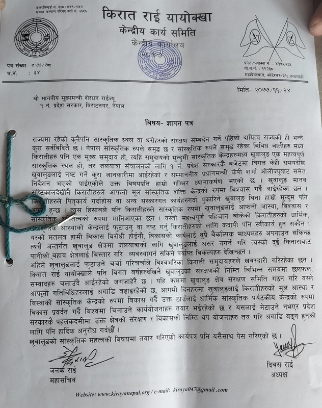 सोमबार किरात राई यायोक्खाले अरुण, तमोर र दुधकोशीको त्रिवेणीमा रहेको खुवालुङ (नदीको बिच भागमा रहेको ठूलो ढुंगो)लाई संरक्षण गर्न माग गर्दै मुख्यमन्त्री राईलाई ज्ञापन–पत्र बुझाएपछि मुख्यमन्त्री राईले सो कुरा बताएका हुन् ।