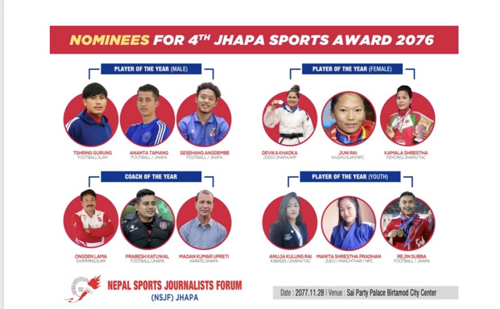 मनोनितमध्ये एकजनाले कार्यक्रमको दिन नगदसहित ट्रफी प्राप्त गर्नेछन् । यसपालिको अवार्ड कार्यक्रमका मनोनीतहरुमा वर्ष उत्कृष्ट खेलाडी (पुरुष) मा अनन्त तामाङ (फुटबल), सेसेहाङ आङदेम्बे (फुटबल) र छिरिङ गुरुङ (फुटबल) छन्् । तामाङ र आङदेम्बे झापा र गुरुङ इलामका हुन् । त्यस्तै, वर्ष उत्कृष्ट खेलाडी (महिला) मा जुनी राई (उसु), देविका खड्का (जुडो) र कमला श्रेष्ठ (फेन्सिङ) रहेका छन् । राई इलाम तथा खड्का र श्रेष्ठ झापाका हुन् ।