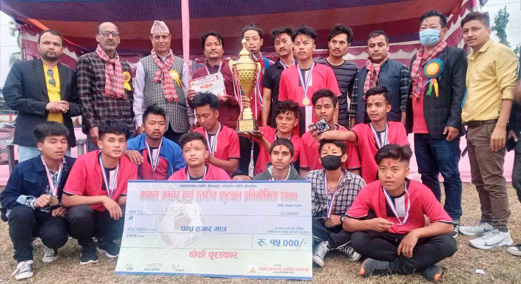 झापा । मदन भण्डारी स्पोटर्स एकाडेमी कमल गाउँपालिकाको आयोजनामा भएको अन्तर वडास्तरीय पुरुष फुटबल प्रतियोगिताको उपाधि कमल गाउँपालिका वडा नं. ५ ले हात पारेको छ ।
