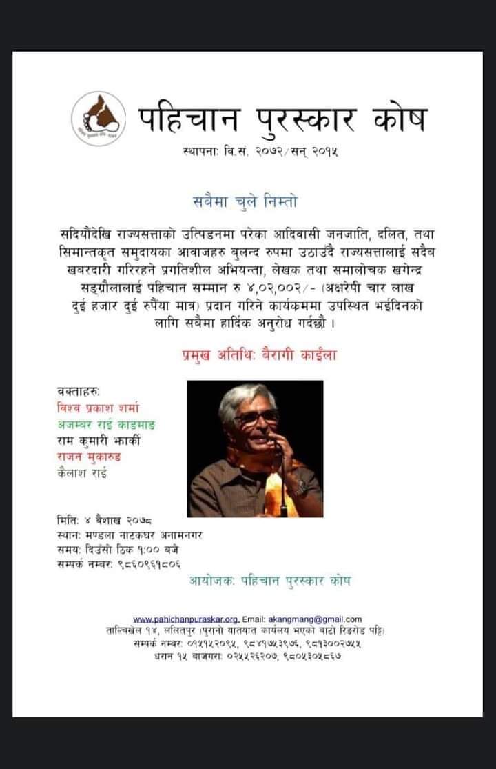 काठमाडौं, २ वैशाख । प्रखर लेखक एवम् समलोचक खगेन्द्र संग्रौला पहिचान पुरस्कारबाट पुरस्कृत हुने भएका छन् ।