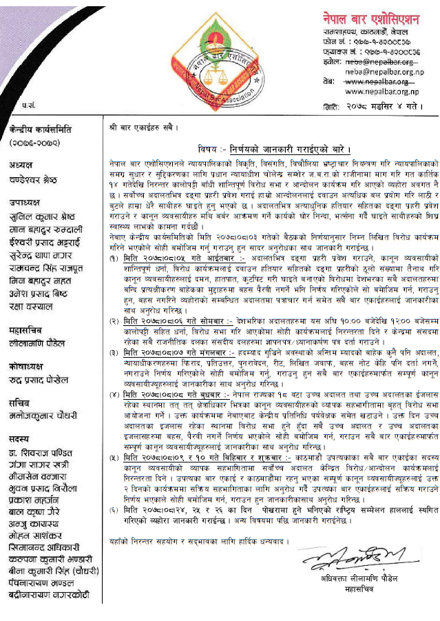 बारले मंगलबारको आन्दोलनका क्रममा हतम्याद गुज्रिने अवस्थाको अन्तिम म्यादको बाहेक कुनै पनि अदालत, न्यायाधीकरणहरूमा फिराद, प्रत्युत्तर, पुनरेदन रिट, लिखित जवाफ, बहस नोट केही पनि दर्ता नगर्ने नगराइने जनाएको छ ।