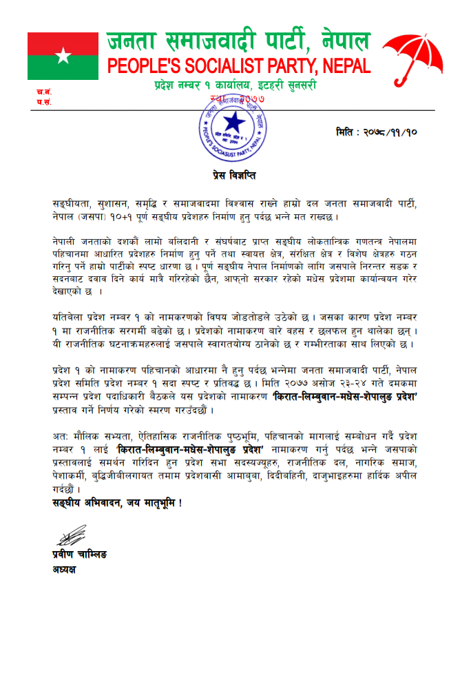अध्यक्ष प्रवीण चाम्लिङले मंगलबार जारी गरेको विज्ञप्तिमा प्रदेश नामाकरण सम्बन्धमा २०७७ असोज २३–२४ गते नै निर्णय गरिएको उल्ल्खे गर्दै प्रदेश १ को नामाकरण पहिचानको आधारमा नै हुनु पर्दछ भन्नेमा जसपा स्पष्ट र प्रतिवद्ध रहेको उल्लेख छ । विज्ञप्तिमा भनिएको छ– ‘मौलिक सभ्यता, ऐतिहासिक राजनीतिक पुष्ठभूमि, पहिचानको मागलाई सम्बोधन गर्दै प्रदेश नम्बर १ लाई ‘किरात–लिम्बुवान–मधेस–शेपालुङ प्रदेश’ नामाकरण गर्नु पर्दछ ।’