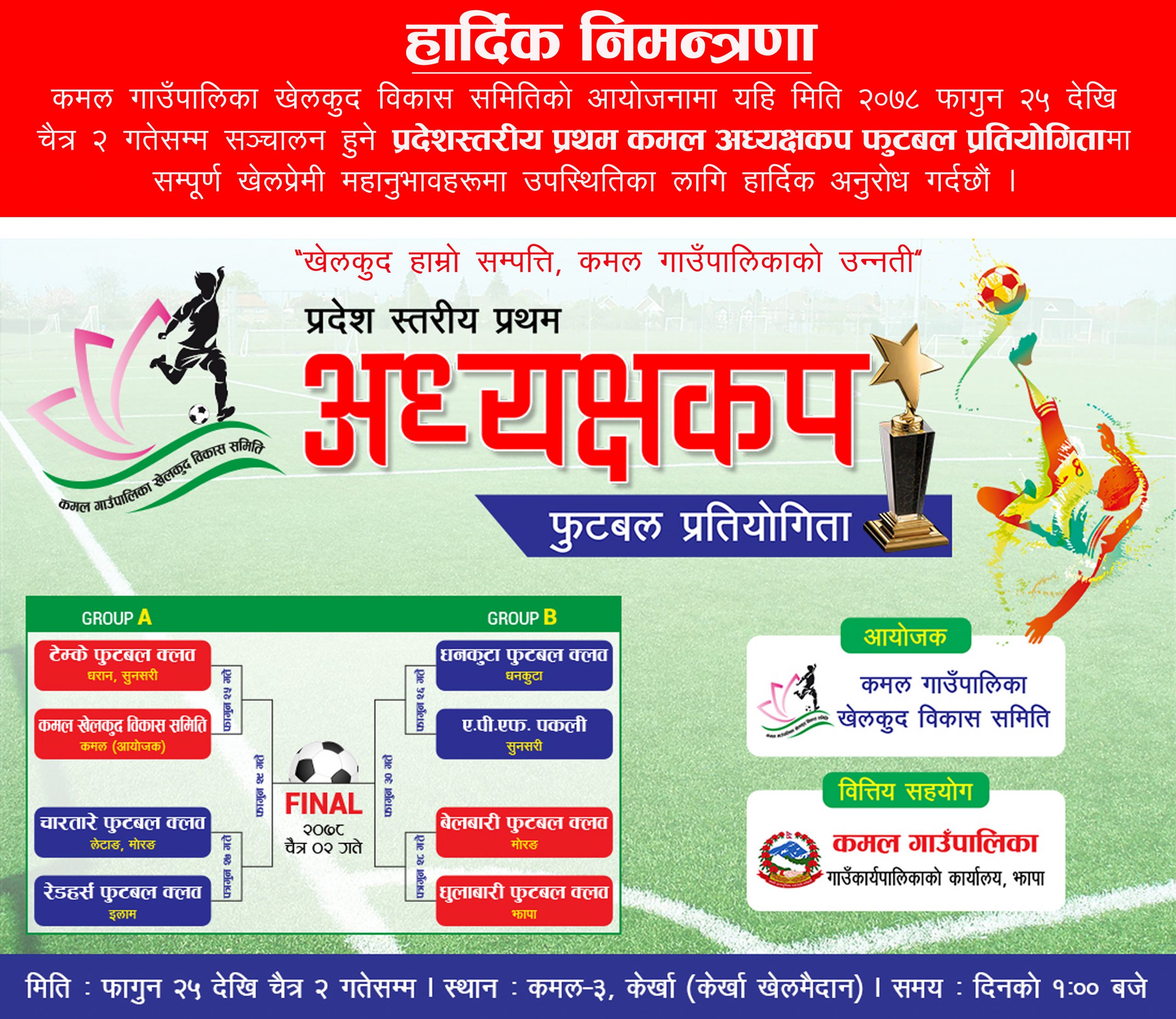 ३० फागुनसम्म हुने प्रतियोगिताको विजेताले नगद १२ लाख ५५ हजार र उपविजेताले ६ लाख ५ हजार पुरस्कार पाउने आयोजक समिति अध्यक्ष विनोद बस्नेतले जानकारी दिए ।
