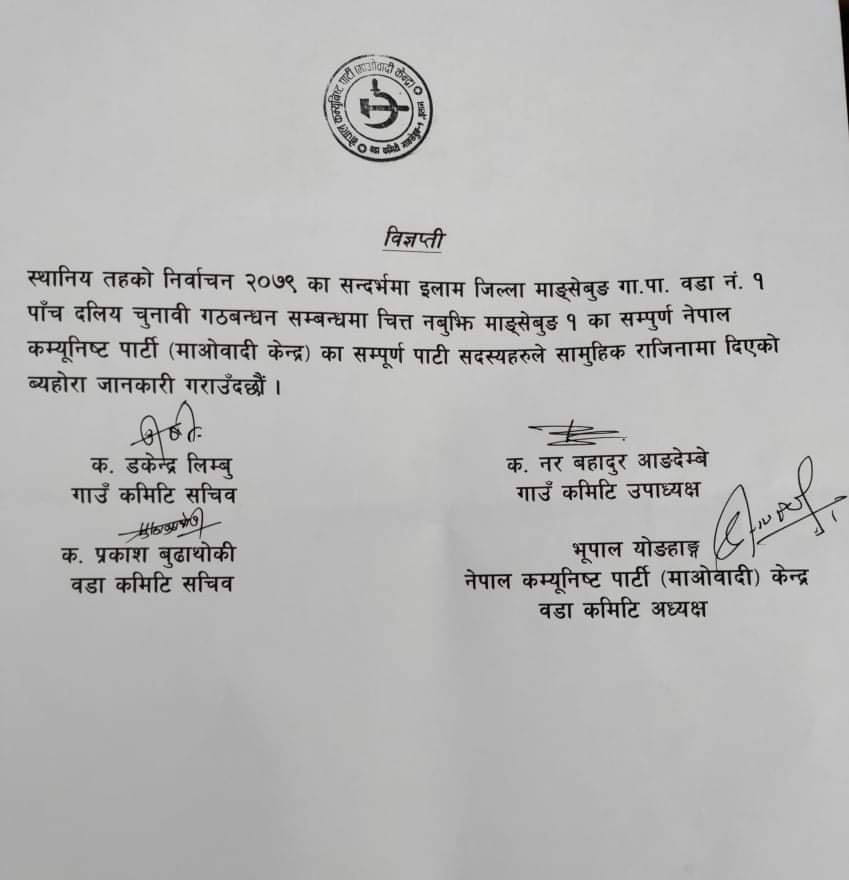 माङसेबुङ, १२ बैशाख । बैशाख ३० गते हुने स्थानीय तहको निर्वाचनमा पाँच दलीय गठबन्धन चित्त नबुझेका कारण नेपाल कम्युनिष्टपार्टी (माओवादी केन्द्र) माङसेबुङ वडा नं. १ का नेता कार्यकर्ताहरुले सामुहिक राजिनामा दिएका छन् ।