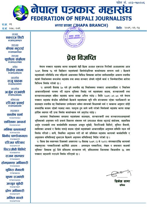 साथै, नेपाल पत्रकार महासंघ केन्द्रीय समितिको बैठकले महासंघका कुनै पनि संरचनामा रहेका पदाधिकारी वा सदस्यहरु स्थानीय तह निर्वाचनमा उम्मेदवार बनेमा संस्थाको विधानको मर्म र व्यवस्था अनुसार सोही समयदेखि कायम रहेको पदबाट स्वतः पदमुक्त हुन जाने भनी गरेको निणर्यको महासंघ झापा शाखाले स्वागत गर्दै उक्त निणर्य कार्यान्वयन गर्न अनुरोध गरेको छ ।