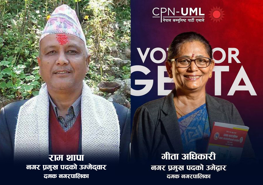 दमक वडा नम्बर १, २, ९, १० र वडा नम्बर ३ को २६९९ मत गणना भइसक्दा प्रमुख पदमा थापा ८ हजार २ सय ९९ मत पाएर उनका प्रतिद्वन्द्वी नेकपा एमालेकी गीता अधिकारी भन्दा ६२२ ले अघि छन् ।