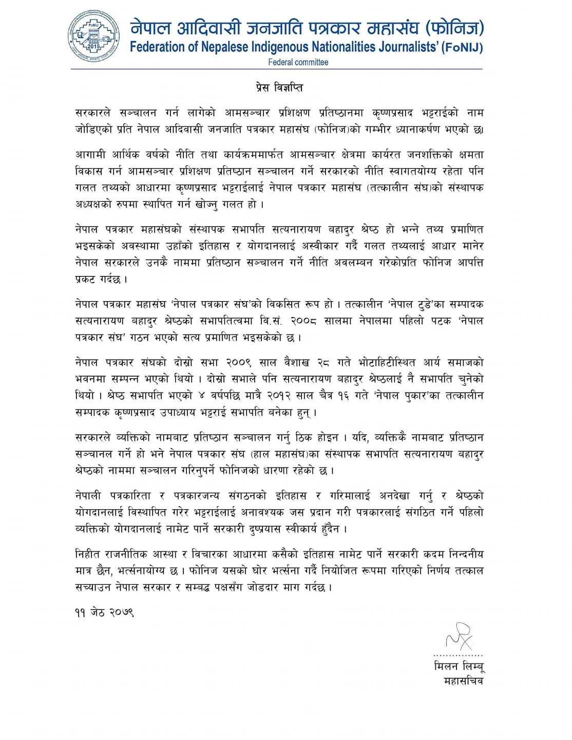 सरकारले गलत तथ्यका आधारमा कृष्णप्रसाद भट्टराईको नाममा आमसञ्चार प्रशिक्षण प्रतिष्ठान सञ्चालन गर्न लागेको भन्दै फोनिज संघीय समितिले त्यसको विरोध गरेको हो ।