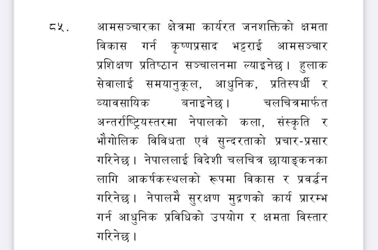 मंगलबार सरकारको भावी नीति तथा कार्यक्रम प्रस्तुत भएकोमा ८५ नम्बर बुँदामा ‘आमसञ्चार क्षेत्रमा कार्यरत जनशक्तिको क्षमता विकास गर्न कृष्णप्रसाद भट्टराई आमसञ्चार प्रशिक्षण प्रतिष्ठान सञ्चालनमा ल्याइनेछ’, भन्ने उल्लेख छ ।