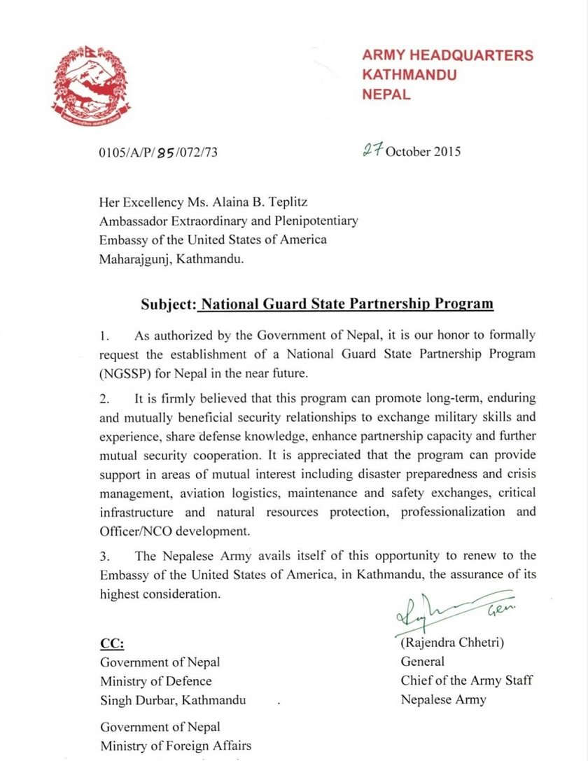 नेपालका तर्फबाट तत्कालीन नेपाली सेनाका प्रधानसेनापति राजेन्द्र क्षेत्रीले हस्ताक्षर गरेर पत्र पठाएको खुलासा भएको हो । क्षेत्रीले तत्कालीन अमेरिकी राजदूत अलाइना बी तेप्लिजलाई पत्र लेख्दै नेपाल सरकारका तर्फबाट आधिकारिक रुपमा नेशनल गार्ड स्टेट पार्टनरसिप प्रोग्राम (एनजीएसएसपी) सहभागी हुनका लागि अनुरोध गरिएको छ ।
