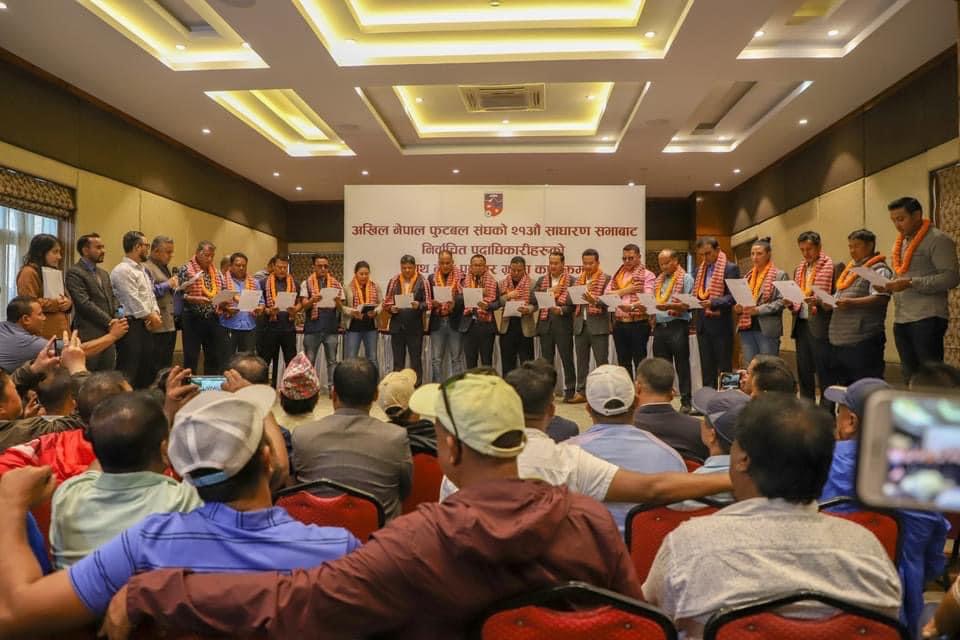 एन्फाका नवनिर्वाचित अध्यक्ष लगायत पदाधिकारीहरू सपथ लिंदै