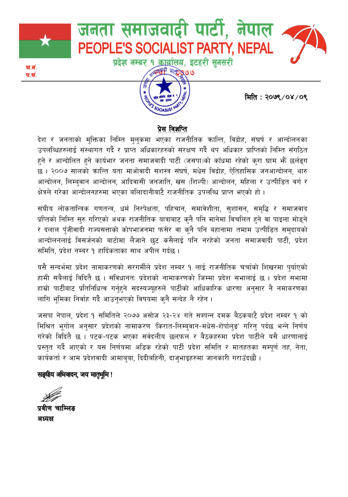जसपा प्रदेश १ अध्यक्ष प्रवीण चाम्लिङबाट हस्ताक्षरित विज्ञप्तिमा भनिएको छ –‘पहिचान, समावेशीता, सुशासन, समृद्धि र समाजवाद प्रप्तिको निम्ति सुरु गरिएको अथक राजनीतिक यात्राबाट कुनै पनि मानेमा विचलित हुने वा पाइला मोड्ने र दलाल पुँजीवादी राज्यसत्ताको कोपभाजनमा फसेर वा कुनै पनि बहानामा तमाम उत्पीडित समुदायको आन्दोलनलाई विसर्जनको बाटोमा लैजाने छुट कसैलाई पनि नरहेको जनता समाजवादी पार्टी, प्रदेश समिति, प्रदेश नम्बर १ हार्दिकताका साथ अपील गर्दछ ।’