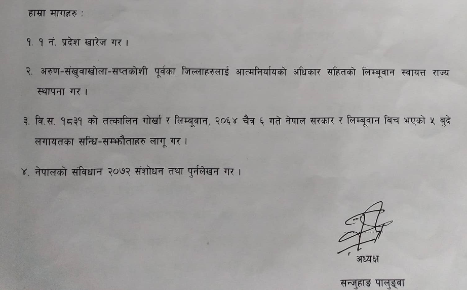 संघीय लिम्बुवान पार्टीले प्रदेश नम्बर १ को खोजीको मागसहित ध्यानाकर्षणपत्र बुझाएको छ ।