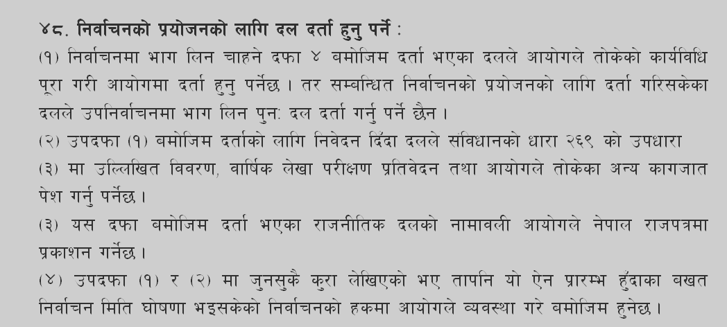 राजनीतिक दल सम्बन्धि ऐन २०७३ मा प्रत्यक्ष र समानुपातिक तर्फ निर्वाचनमा भाग लिन दल दर्ता गराउनुपर्ने प्रावधान छ ।