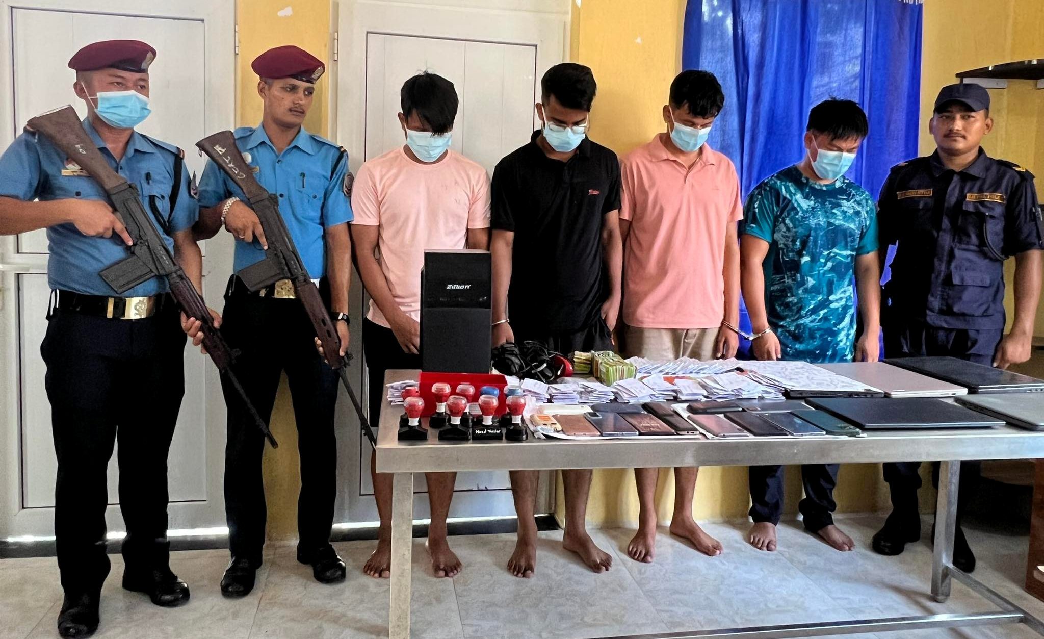 अनलाइन गेमिङमार्फत नेपालमा प्रतिवन्धित जुवा खेलाउने र विभिन्न सरकारी कार्यालयको छाप र कागजात किर्ते गर्ने गिरोहलाई प्रहरी पक्राउ गरी सोमबार सार्वजनिक गरेको छ ।