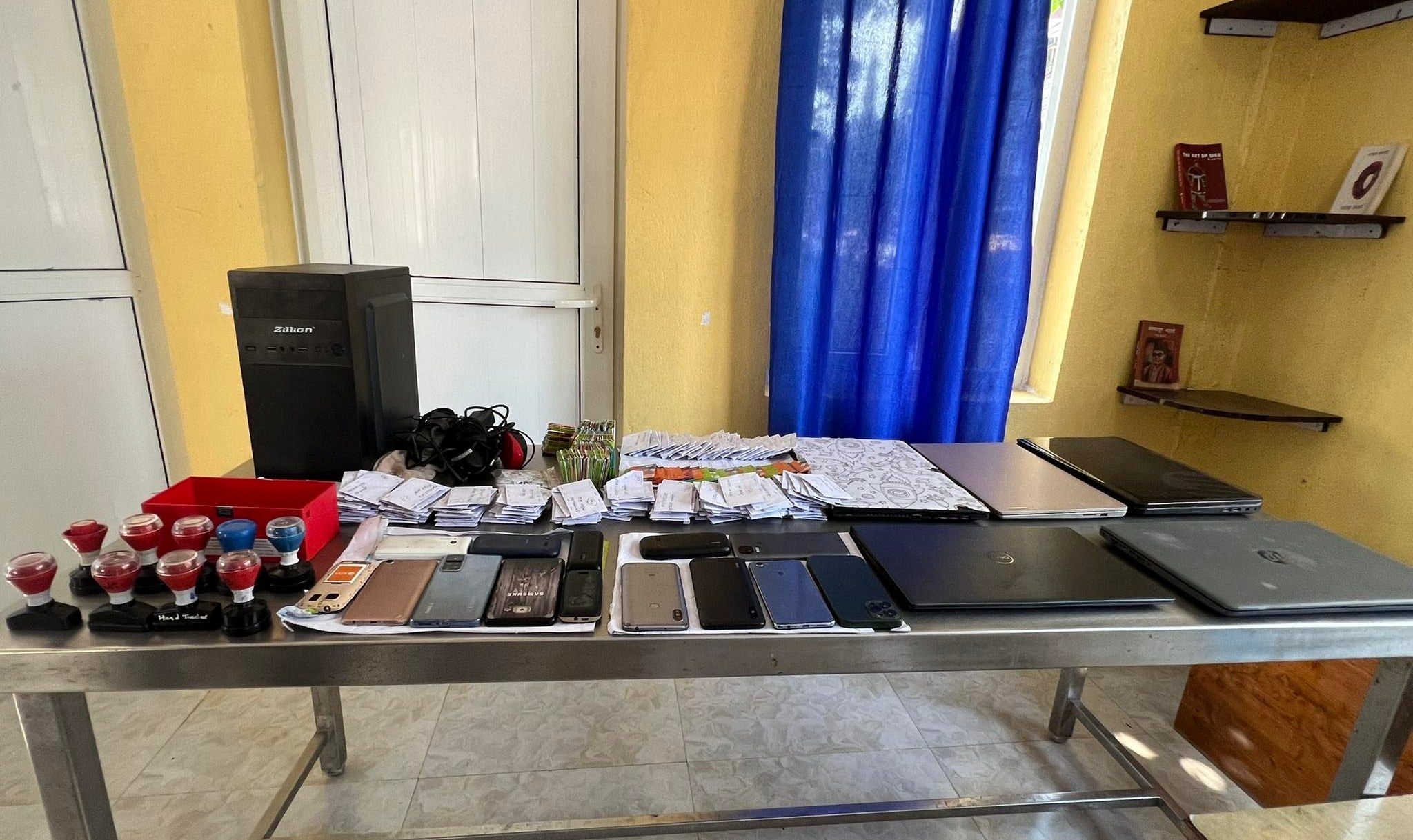 प्रहरीले पद्मा कन्सल्टेन्सी र योर्स कम्युनिकेशन एण्ड फोटो स्टुडियोबाट बिभिन्न कम्पनीका १९ थान मोबाइल, ४ थान ल्यापटप, सिपीयु र प्रयोगमा ल्याइएका २ सय ८० थान र प्रयोगमा नआएका ४५ थान गरी ३ सय २५ थान एनसेलको सिमकार्ड समेत ठूलो मात्रामा बरामद गरेको छ । त्यस्तै नेपालको निशान भएको नक्कली छाप, नेपाल सरकार राष्ट्रिय परीक्षा बोर्डको नक्कली छाप, दमक २ का वडाध्यक्ष प्रजापति सापकोटाको नाममा नक्कली छाप, विभिन्न विद्यालय र प्रधानाध्यापकहरुको नाममा नक्कली छाप बरामत गरेको छ ।