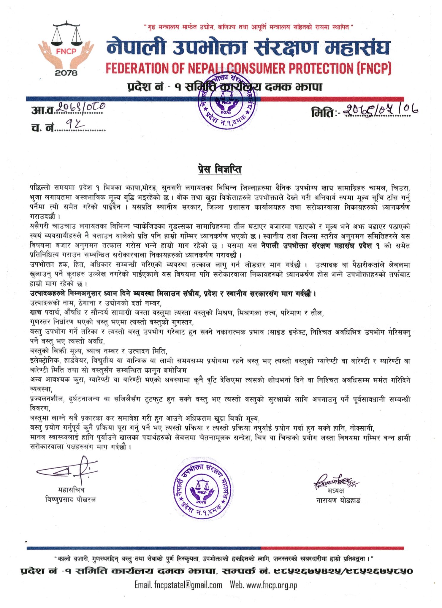 विज्ञप्तिमा भनिएको छ – ‘चाउचाउ लगायतका प्याकेजिङमा नुडल्सका सामग्रीहरुमा तौल घटाएर बजारमा पठाएको र मूल्य भने अझ बढाएर पठाएको स्वयम् व्यवसायीहरुले नै बताउन थालेको प्रति पनि हाम्रो गम्भीर ध्यानाकर्षण भएको छ । स्थानीय तथा जिल्लास्तरीय अनुगमन समितिहरुले यस विषयमा बजार अनुगमन तत्काल गरोस् भन्ने हाम्रो माग रहेको छ । यसमा यस नेपाल उपभोक्ता संरक्षण महासंघ प्रदेश १ को समेत प्रतिनिधित्व गराउन सम्बन्धित सरोकारवाला निकायहरुको ध्यानाकर्षण गराउँदछौं ।’