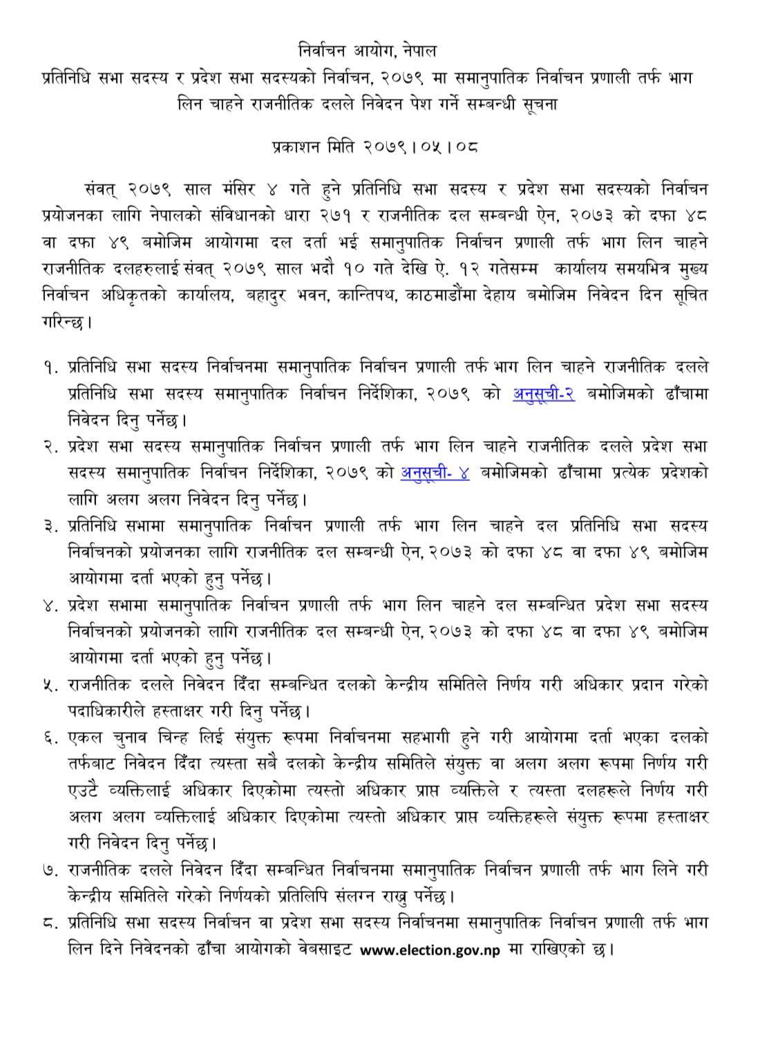 निर्वाचन आयोगले बुधबार (आज) बिहान सूचना प्रकाशित गरेर समानुपातिकतर्फ भाग लिन चाहने राजनीतिक दललाई भदौ १० गतेदेखि १२ गतेसम्म निवेदन पेस गर्न आह्वान गरेको छ ।