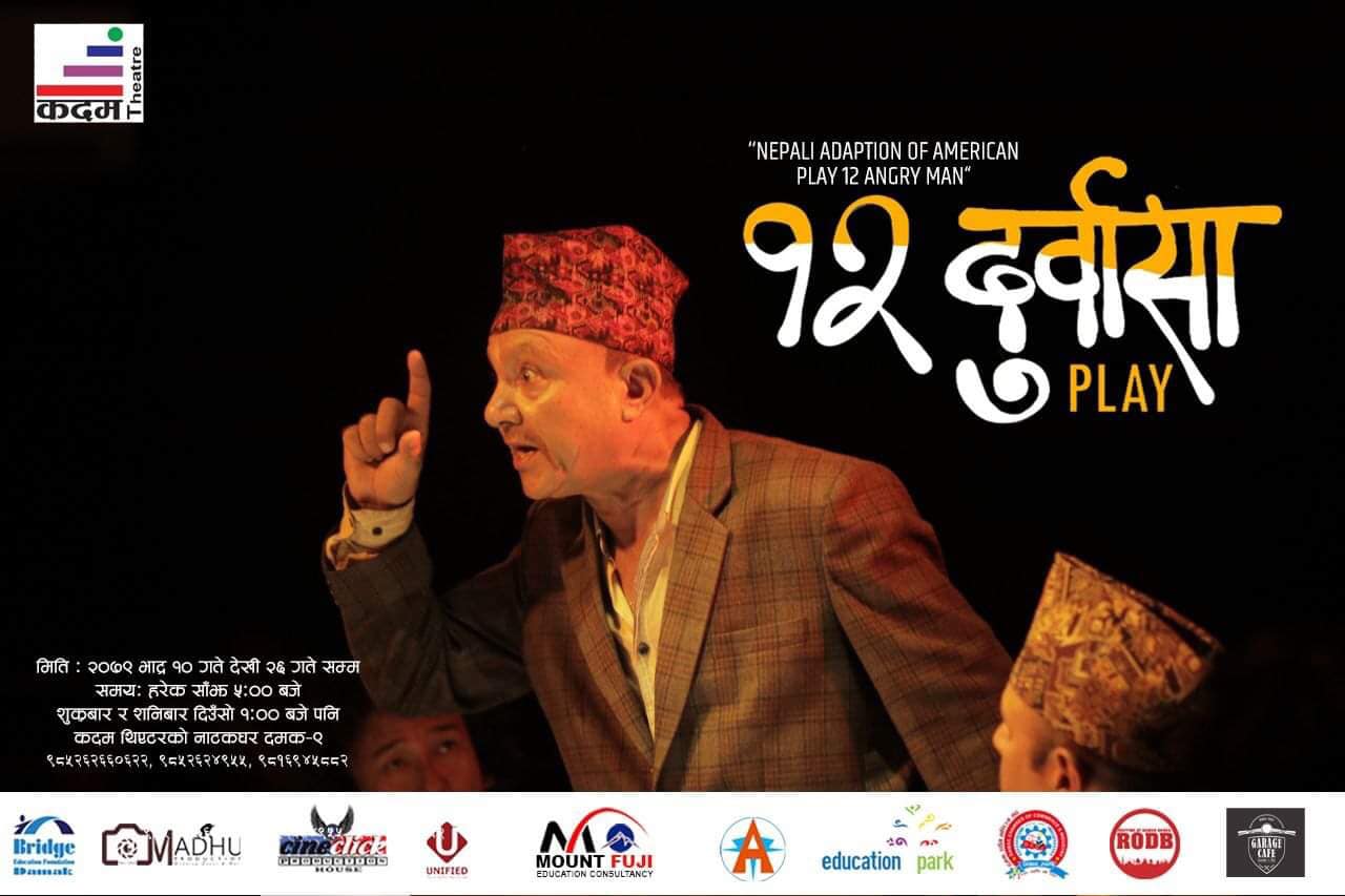 विश्व प्रख्यात नाटक १२ एङ्ग्री मेन को नेपाली रूपान्तरण १२ दुर्वाशा को मञ्चन झापाको दमक ९ स्थित कदम थिएटरले गरिरहेको छ ।