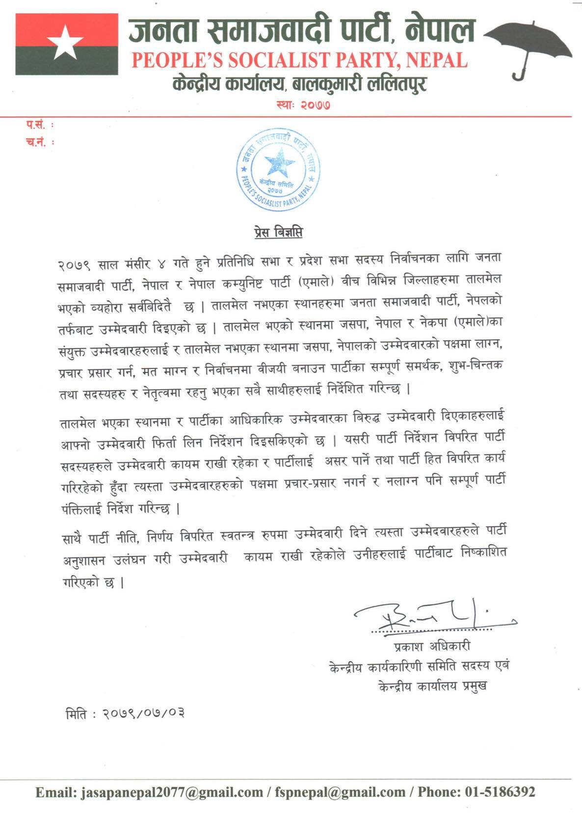 तालमेल भएका स्थानमा जसपा, नेपाल र नेकपा (एमाले)का संयुक्त उम्मेद्वारहरुलाई र तालमेल नभएका स्थानमा जसपा, नेपालका उम्मेद्वारको पक्षमा लाग्न, प्रचार प्रसार गर्न, मत माग्न र निर्वाचनमा विजयी बनाउन जसपा केन्द्रीय कार्यालयले निर्देशन जारी गरेको हो ।