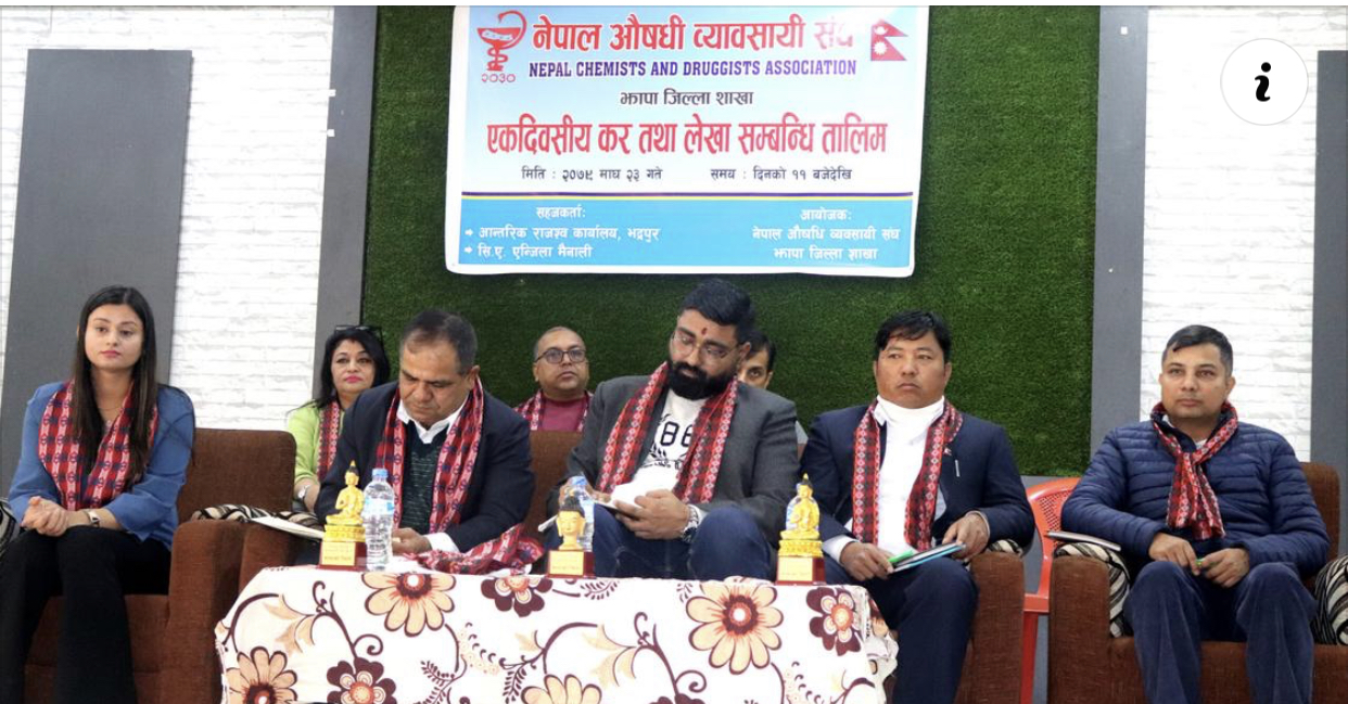 नेपाल औषधि व्यवसायी संघ झापाले आयोजना गरेको कार्यक्रममा आन्तरिक राजश्व कार्यालय झापाका प्रमुख कर अधिकृत शुभ रिजालले तालिमको उद्घाटन गरेका थिए । आन्तरिक राजश्व कार्यालयका कर अधिकृतद्वय भीम आचार्य र छत्र लिम्बू र सीए एञ्जिला मैनालीले तालिमको सहजीकारण गरेका थिए ।