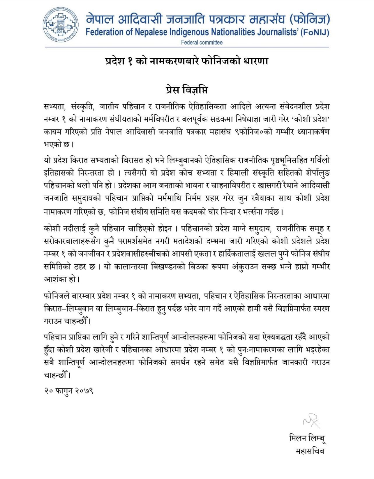 फोनिज संघीय समितिले शनिबार जारी गरेको विज्ञप्तिमा भनिएको छ –‘संघीयताको मर्म विपरित र बलपूर्वक सडकमा निषेधाज्ञाजारी गरेर ‘कोशी प्रदेश’ कायम गरिएको प्रति नेपाल आदिवासी जनजाति पत्रकार महासंघ (फोनिज) को गम्भीर ध्यानाकर्षण भएकोछ ।’