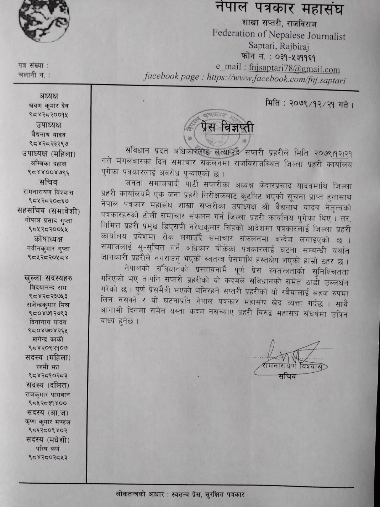 यसैबीच घटना बारे जानकारी पाए लगत्तै सत्यतथ्य बुझ्न र सूचना संकलन गएका प्रत्रकारहरुलाई प्रहरी कार्यालयभित्र जान रोकलगाइएको नेपाल पत्रकार महासंघ सप्तरी शाखाले जनाएको छ ।