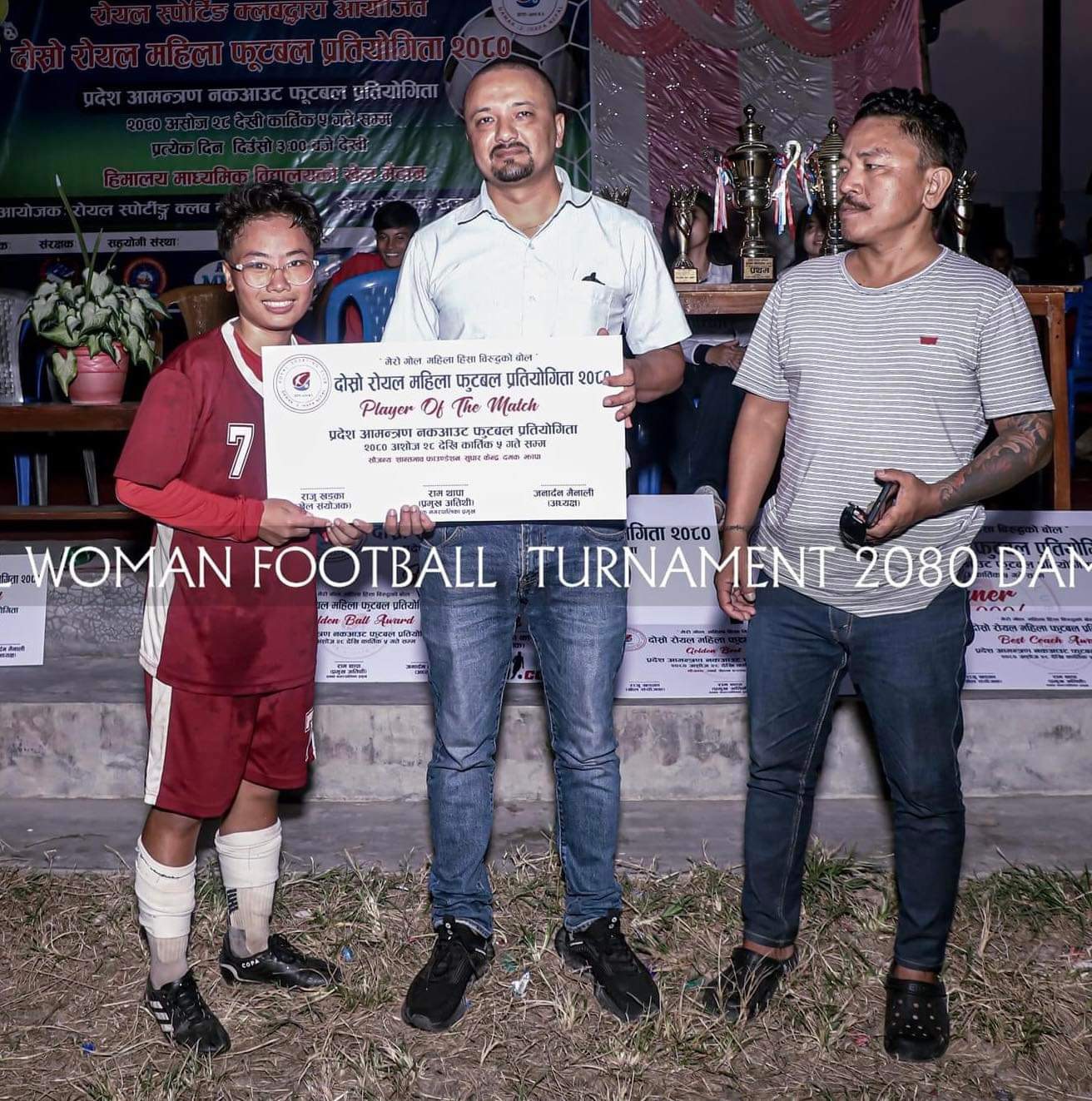खेलको प्लेयर अफ द म्याच धरानकि २ गोल गरेकि समिक्षा मगर घोषित भइन् । सम्पूर्ण खेलको प्लेयर अफ द म्याचको पुरस्कार शान्त भाव सुधार केन्द्र दमक-६ ले सौजन्य गरेको आयोजक कमिटिले जानकारी दिए ।