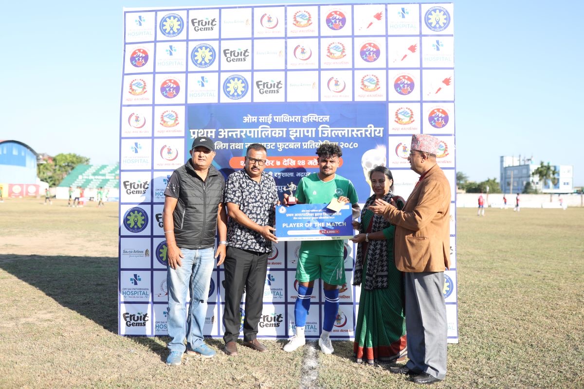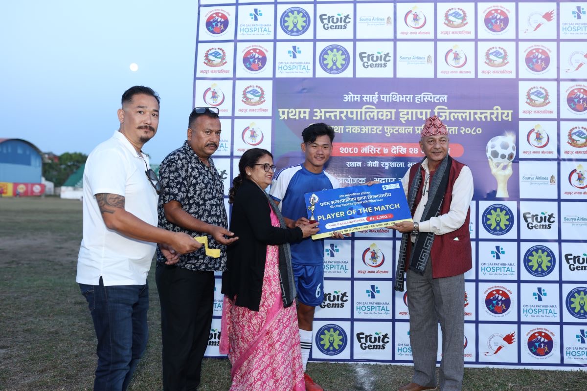 खेलको प्लेयर अफ दि म्याच मेचीनगरका सिमान्त थापा भए । उनलाई गोल्डकपका अध्यक्ष दिपेश ढकाल, मेचीनगरका नगरप्रमुख गोपादचन्द्र बुढाथोकी, उपप्रमुख मिना पोखरेल, सौजन्यकर्ता झापा उद्योग वाणिज्य संघका अध्यक्ष प्रज्ज्वल राईले नगद दुई हजार र ट्रफी प्रदान गरे ।