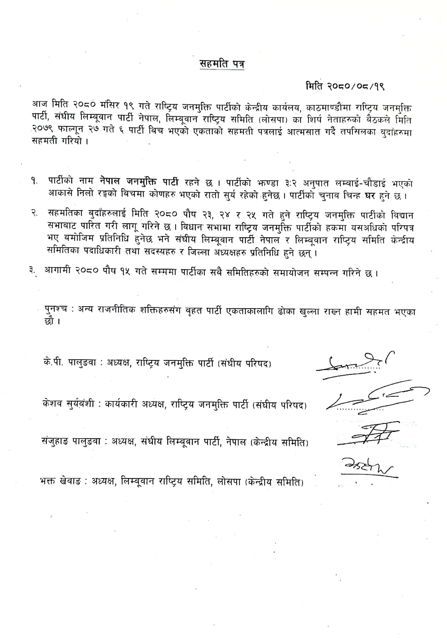 सहमति पत्रमा जनमुक्तिका अध्यक्ष पालुङ्वा र कार्यकारी अध्यक्ष केशव सूर्यवंशीले हस्ताषर गरेका छन् भने संघीय लिम्बुवानपार्टीका अध्यक्ष सञ्जुहाङ पालुङ्वा र लोसपा निकट लिम्बुवान राष्ट्रिय समितिका अध्यक्ष भक्त खेबाङले हस्ताक्षर गरेका छन् ।