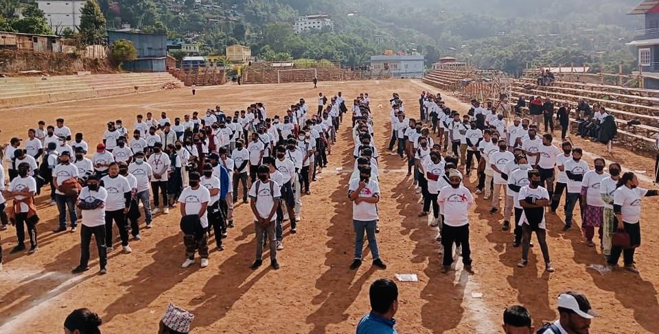 फिदिम माविको खेलमैदानमा भेला भएका युवाहरूले पहिचानका लागि युवा लेखिएको सेतो भेस्ट लगाएका थिए ।