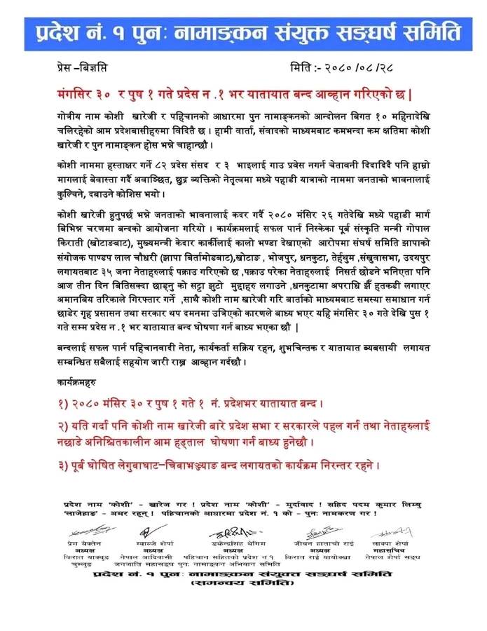 प्रदेश १ का कोशी नाम खारेजीका लागि निरन्तर अन्दोलन गरिरहेको प्रदेश १ पुनः नामाङ्कन संयुक्त संघर्ष समितिले मंसिर ३० र पुष १ गते प्रदेशभर यातायात बन्दको आव्हान गरेको छ ।