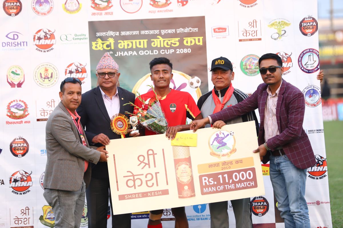 खेलको प्लेयर अफ दि म्याच आर्मीका वसन्त जिम्बा घोषित भए । उनलाई कोशी प्रदेशका पूर्वमुख्यमन्त्री हिक्मत कार्कीलगायतले नगद ११ हजार र ट्रफी प्रदान गरे ।